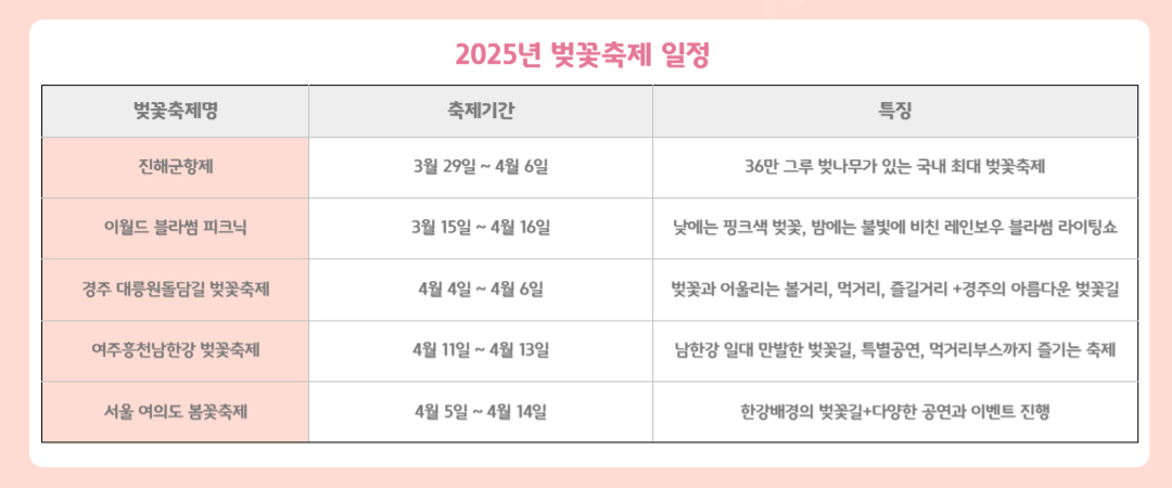 2025년에는 평년보다 3~8일 정도 빠른 벚꽃개화가 예상되어 있으니 벚꽃개화시기, 벚꽃 축제일정, 벚꽃명소 확인하시고 전국곳곳 아름다운 벚꽃구경 다녀오시기 바랍니다.